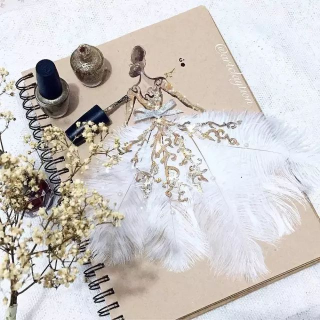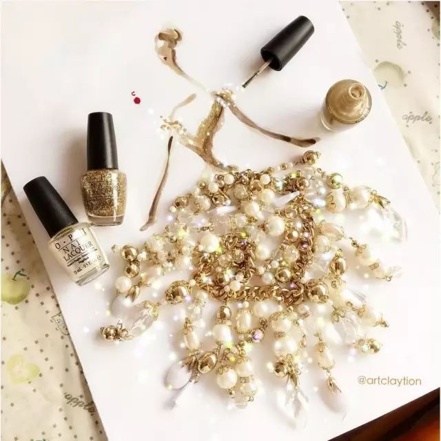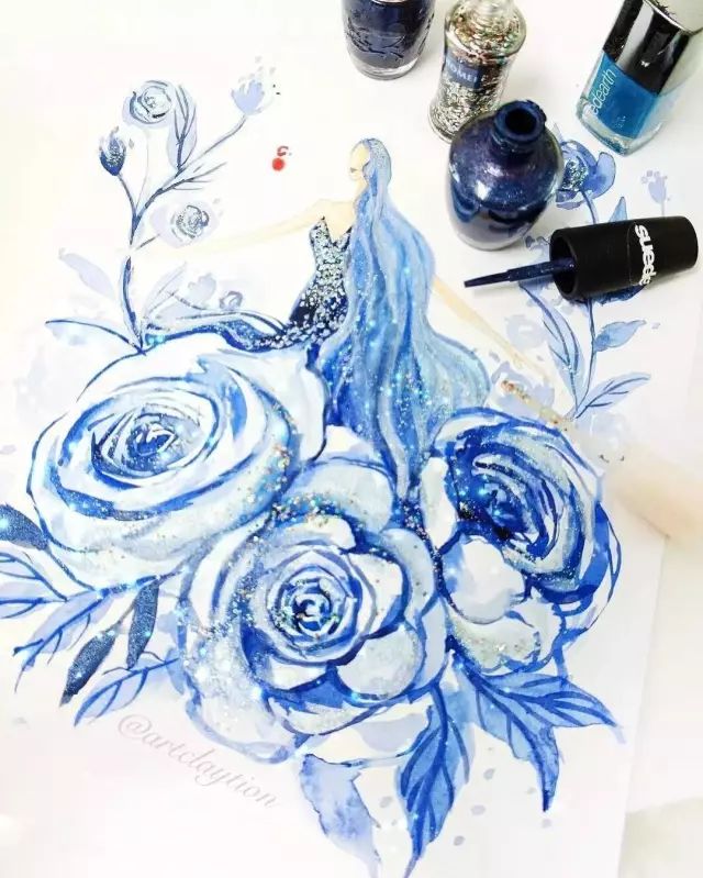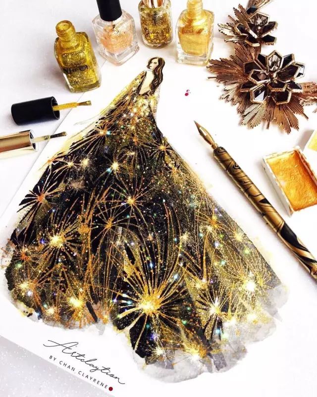 Clayrene先由水彩绘制模特大概轮廓,然后用指甲油在覆蓋在上面,做细节修饰。指甲油反亮以及自带高光的特性,让裙子的高级感油然而生。