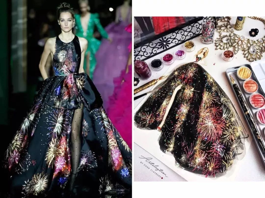 Zuhair Murad高定春夏 2017,她用钢笔加金属色的指甲油,描绘勾勒出裙装上一条条,犹如璀璨烟火的花纹。