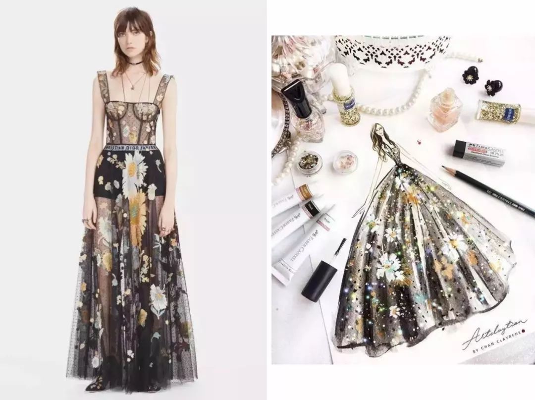 Christian Dior早秋 2017的透明礼服,在她的画笔下更加的雍容华贵。