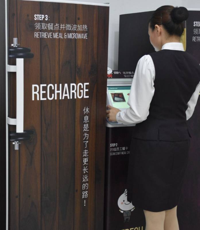 而休息室里的一大亮点,是快让员工点选餐点的“便当冰箱”。员工依喜好选择餐点后,只需用职员卡触碰机器,便可打开相应的冰格,取出食物再加热即可。