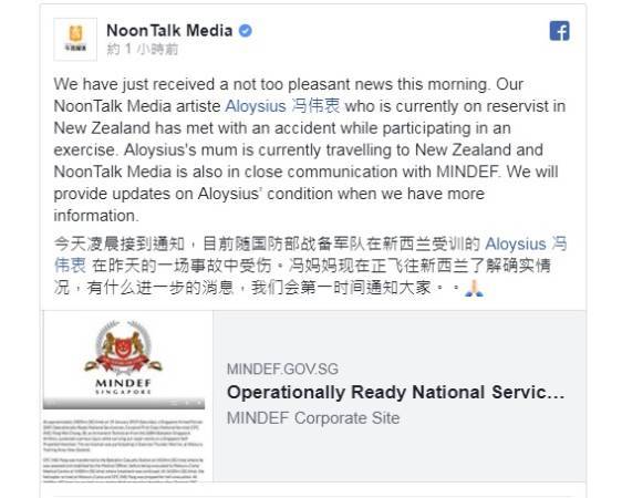 (新加坡20日讯)新加坡艺人冯伟衷昨日在新西兰参与军训时,不幸受重伤,并紧急送院急救动手术后,目前,他意识清醒。