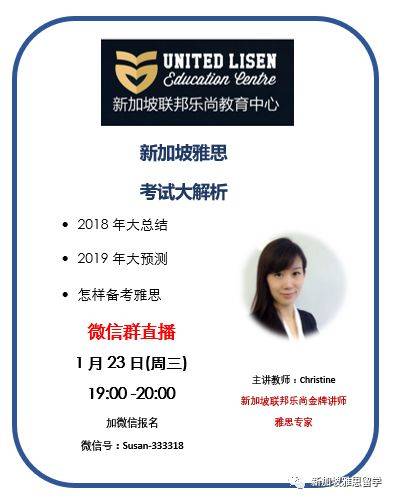 广告作为新加坡考区官方考点和雅思培训领跑者,联邦乐尚雅思中心给烤鸭们发福利了!无论你是初次接触雅思考试,还是已经备考了一段时间,了解雅思的最新趋势是非常重要的。我们现通过自己的公益微信授课平台,举行免费公开课向大家普及雅思考试的方向和趋势,以及备考经验。