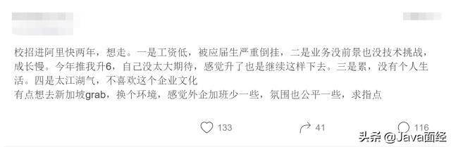 近日,一位网友发帖表示:自己校招进阿里快两年,想走。更列出了四条理由:一是工资低,被应届生严重倒挂;二是业务没前景也没技术挑战,成长慢,今年推我升6,自己没太大期待,感觉升了也是继续这样下去;三是累,没有个人生活;四是太江湖气,不喜欢这个企业文化。他表示想去新加坡grab,换个环境,感觉外企加班少一些,氛围也公平一些,求网友指点。