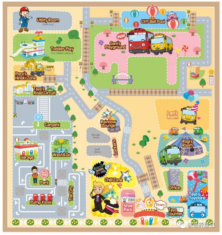 Tayo中最独特的区域是Tayo交通道路区,这是一个儿童大小的“街道”场景。孩子们可以在迷你巴士或汽车骑行中,学习了解道路安全与知识。孩子们可以选择自己的坐骑,在道路中自由穿行。各种交通符号,加油站,修车站,停车站等等的,活脱脱的一个模拟世界,孩子们玩得不亦乐乎。