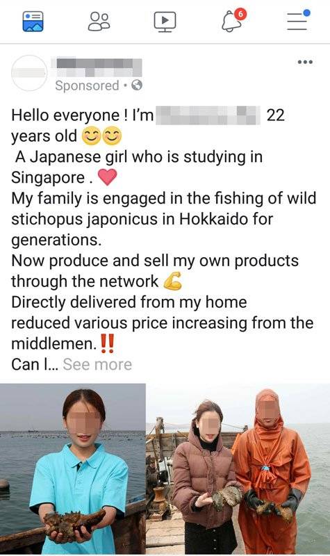 她3周前浏览面子书,看到一名自称在新加坡留学的22岁日本女生的帖文。女生声称家人在北海道养殖海参,今年首次开设面子书网页推销北海道刺参。