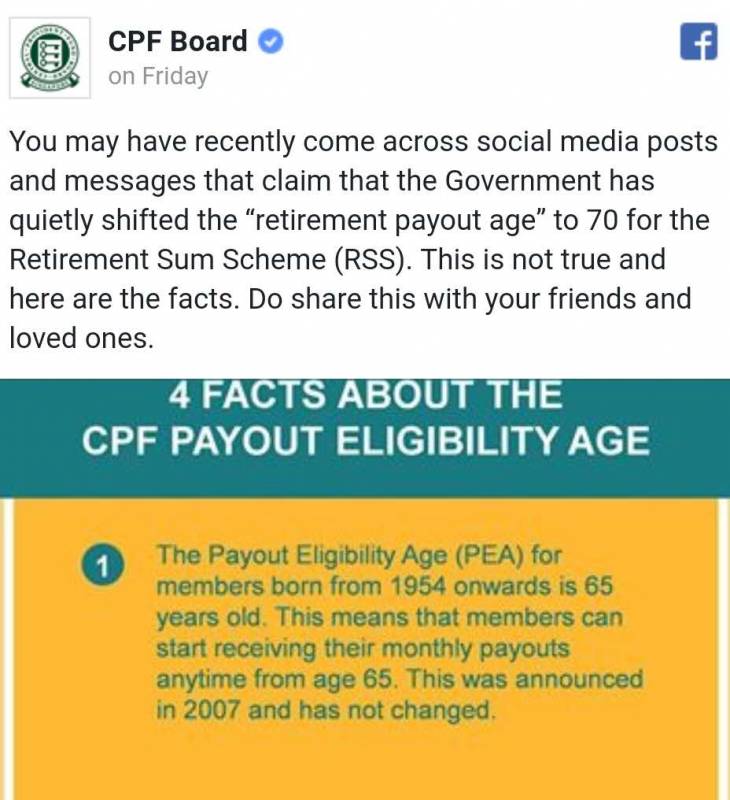 当局在贴文中澄清,那些在1954年以后出生的公众,仍然可以在65岁时领取入息。这在2007年已公布,而且没有改变。