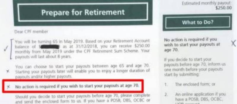 网民Padma FI分享的公积金局信件就提到,“如果您希望从70岁起才领取入息,那您什么都不用做。”