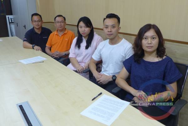 陈珊珊(右起)在曾伟杰、蔡美惠、刘益光与刘家名陪同下召开记者会透露,之前她担任新山市议员时,没有在新山市政局微型法令发现,商店招牌马来文字须占四分之三的条文。