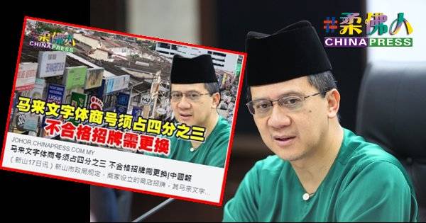 安然日前在新山市政局常月会议后召开记者会时指出,在市议会2011年广告招牌执照微型法令下阐明商家设立的商店招牌,其马来文字体的商号须占面积的四分之三,其他语文字体则不得超过马来文字体的四分之三。