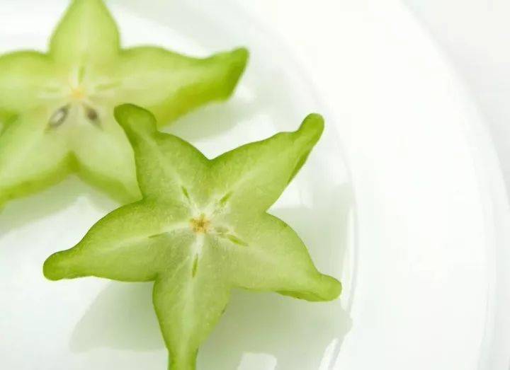 杨桃的剖面会形成一个五角星的形状,因此英文名被叫做Star Fruit。这款水分超足的水果,果汁清凉爽口,外皮脆爽,酸甜可口,解暑消夏,用来酿酒更是有着独特的风味。不过杨桃本身性寒,不要贪吃哟~