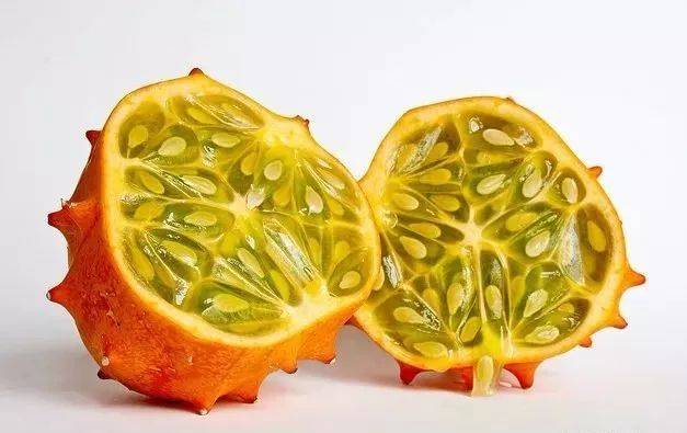 刺角瓜,原产于非洲沙漠。这种水果有着坚硬的表皮,和凹凸不平的小短刺。打开之后,内部的肉质细腻且多籽,有着清甜的口感,吃完之后还会口有余香。对切之后可以挖出果肉享用,也十分适合榨汁饮用。