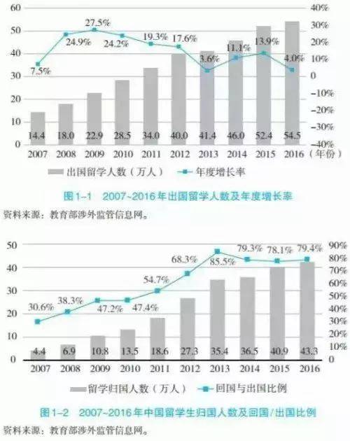 据《2018出国留学蓝皮书》统计,2016年度我国出国留学人员总数为54.45万人,其中自费留学的人数达到49.82万人,占比91%。2017年,我国出国留学人数首次突破60万大关,同比增长11.74%,仍是世界最大留学生生源国。