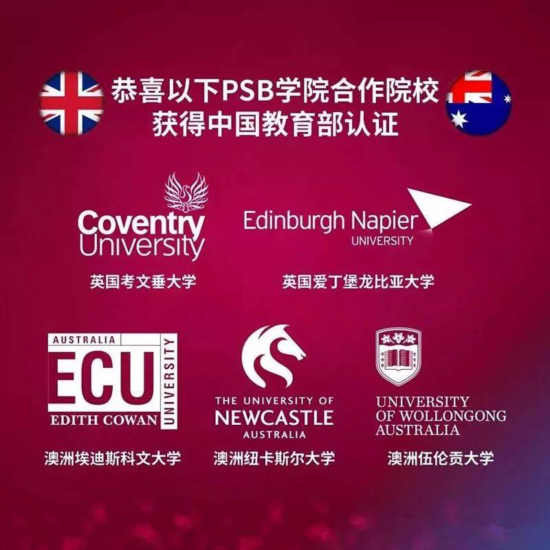 至此,PSB学院有英国和澳洲的五所合作院校获得了中国教育部的认证,它们分别是: