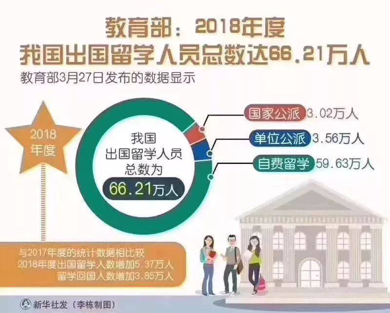 近日,中国教育部公布了2018年中国出国留学数据:2018年度我国出国留学人员总数为66.21万人。其中,国家公派3.02万人,单位公派3.56万人,自费留学59.63万人。