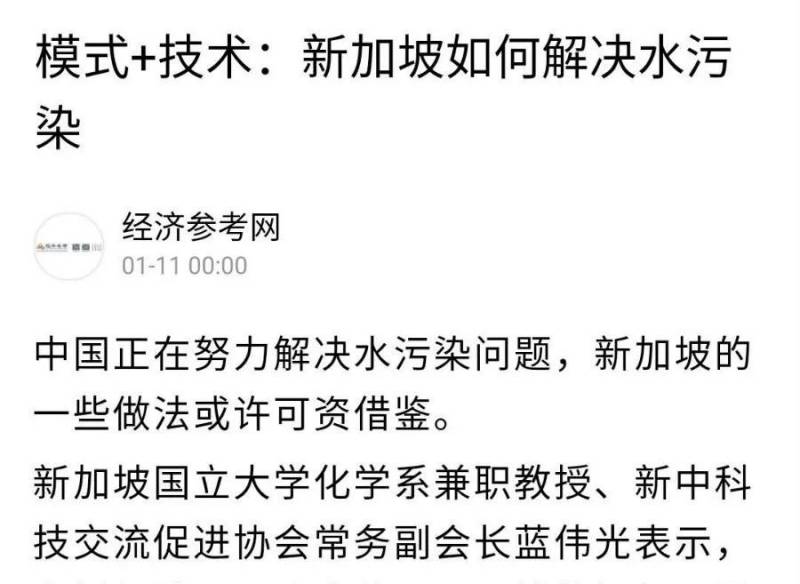 去年底,中国高层访新期间,双方签署了《中国生态环境部同新加坡环境及水源部环境合作备忘录》。作为此次《备忘录》文件签署的见证者之一,蓝伟光曾于此间在新加坡《联合早报》发表了题为《中国水污染治理面临的问题与对策》的暑名文章,由此引起了新华社记者的关注,期间,新华社记者就此问题在新加坡专门采访了蓝伟光博士,并形成了这篇为中央决策提供参考的建设性文章。