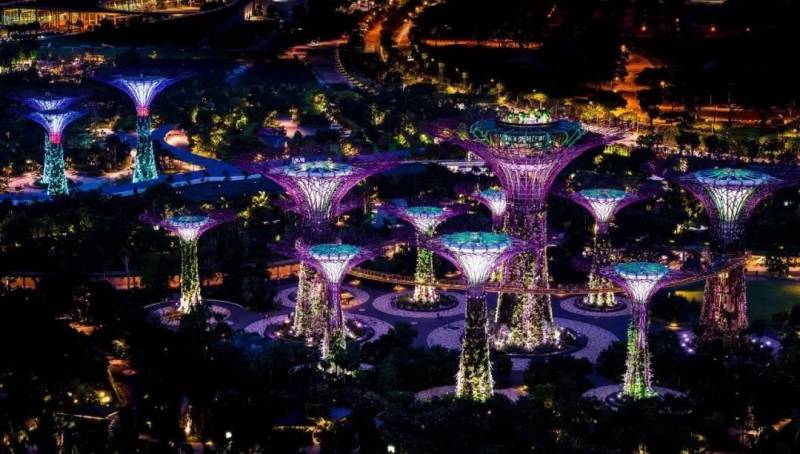 滨海湾南花园里竖立著18棵擎天大树,除了遮阳之外,拥有灌溉和照明功能。夜幕时分,当太阳落下,这些犹如阿凡达的精灵树会散发出神秘的光芒。