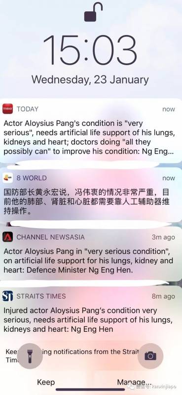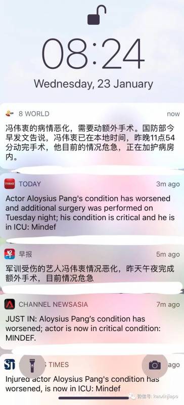 28岁的冯伟衷是新加坡娱乐圈当红小生,上周六(1月19日)在新西兰参加军演受了重伤。今早情况突然恶化,到了下午更是变得危急,心脏、肾脏以及肺脏都需要靠机器维持: