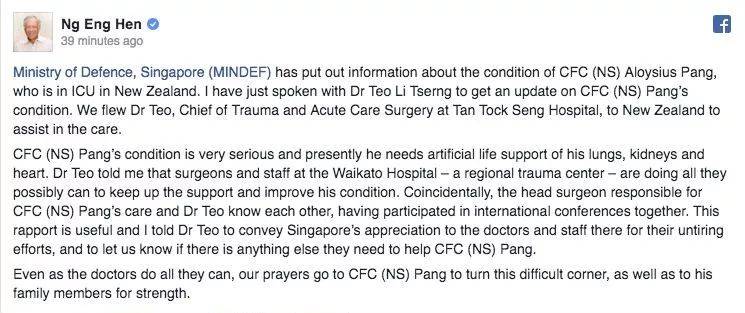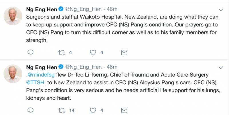 就连新加坡国防部长黄永宏医生也守在社交媒体上,一口气发了两条推文:国防部已经派遣了陈笃生医院外伤急救外科首席张立胜医生,带领一支新加坡医疗团队抵达新西兰,协助当地医院对冯伟衷进行救治。