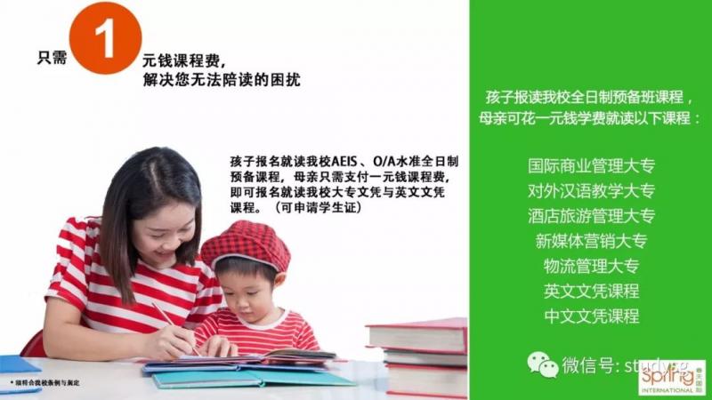 为了解决妈妈们的陪读问题,成就孩子的美好未来;同时也为了妈妈能够学习一门专业课,获得新加坡认可的专业文凭,新加坡春天国际学院首次推出“一元陪读”政策,只要子女报名就读该校的AEIS、O/A水准全日制预备班课程,学校可同时为妈妈申请学生证,就读课该校大专文凭课程或英文文凭课程,课程费只需一块钱。可就读以下课程: