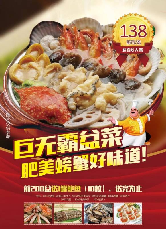 只要138新币,就能吃到日本带子、龙胆石斑鱼片、鲍鱼、莲藕、海参、 花蟹、半壳带子和白萝卜......而且,在家里吃更有团圆的气氛啊,怎么吵怎么闹都可以!
