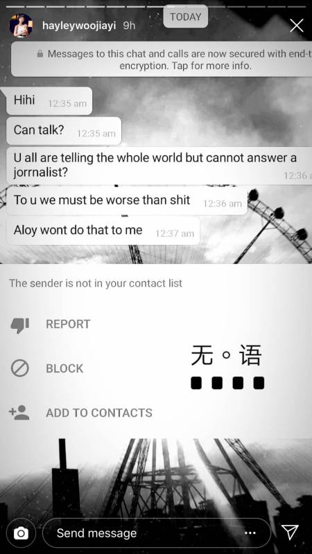 而她的双胞胎姐姐胡佳嬑(Hayley Woo)也发布了一张WhatsApp简讯截图,对方自称是一名记者,但言语之间却非常“不客气”: