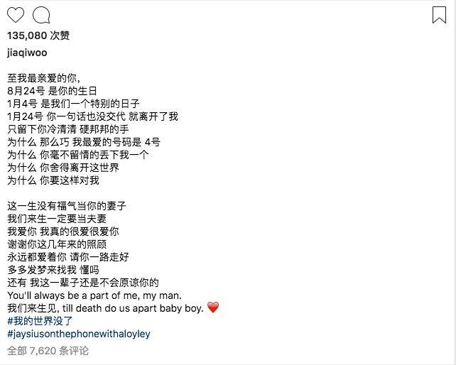 在帖文中,她悲伤得写到:“这一生没有福气当你的妻子,我们来生一定要当夫妻”!