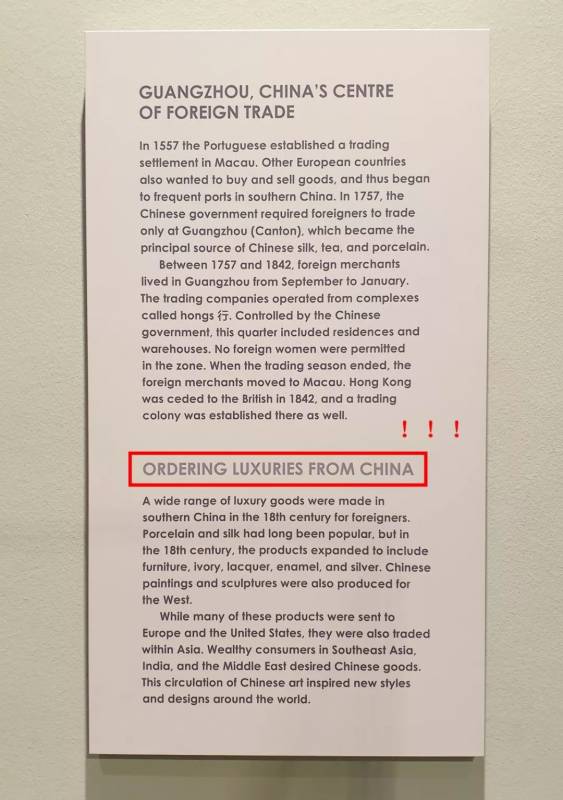 在世界各地的博物馆里,都能找到中国瓷器,呃~~~抢的和偷的暂且不提……当你看到同一制式的杯盘碗碟大量出现时,这就是外销瓷了,顾名思义,专门做了卖给外国人,中国自古就是缺银国,瓷器和茶叶换回了海量白银,很多海底沉船都能打捞出几百上千筐瓷器。外销瓷的历史很悠久,可以追溯到唐代,但从用料和工艺上完全无法与内销瓷相比,到了明清时期,外销瓷可以根据客户需求,进行个性化订制。今天的中国人,全世界的跑着买奢侈品;搁大清,全世界都得挤广州排队去,卖不卖你还两说。