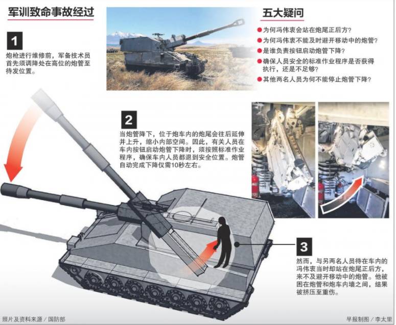 吴仕豪说,冯伟衷当时和另一名军备技术员正准备对SSPH炮枪进行维修,必须将炮管从高位降下。在这过程中,位于炮车内的炮管尾端会往后延伸并上升。