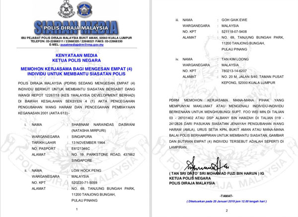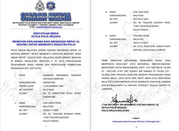 (吉隆坡25日讯)大马警方今日再针对一马发展公司(1MDB)舞弊案,正式通缉4名男女,其中2人是大马年轻富商刘特佐的父母刘福平和吴玉幼。
