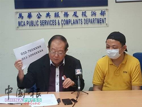 张天赐(左)手持阿窿的电话号码,促请警方对付以非法手段追债的阿窿,右是事主黄先生。