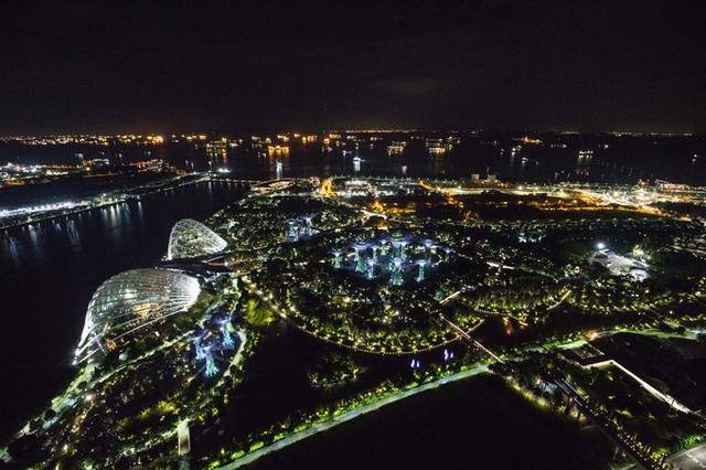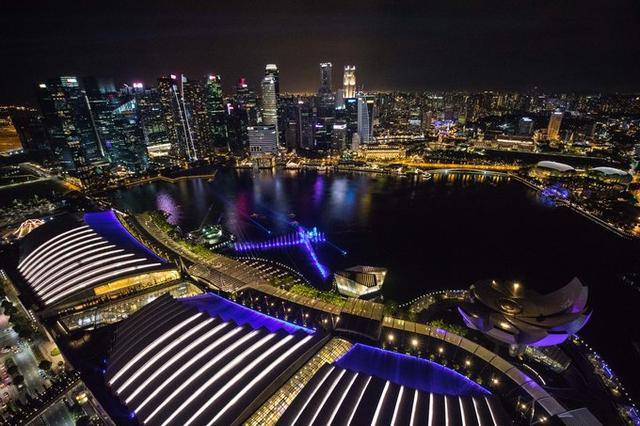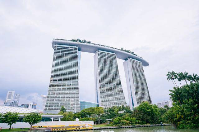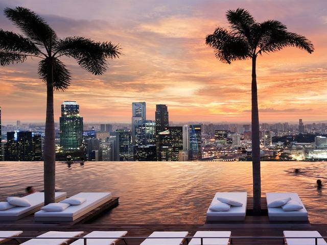 滨海湾金沙酒店由3座55层大楼组成,有2000多间客房,三个大楼被顶部的无边泳池和空中花园连在一起,成大船状,也被叫做诺亚方舟。酒店一共有57层,大约200米高,其中56、57层是空中花园和无边泳池。泳池距离地面的高度是198米,是世界上处于这一高度的最 大户外游泳池。这个泳池是全球最长游泳池,长达150米。泳池连着空中花园,一共大约350米长。无边泳池是网红拍照地,很多人在这里拍照,留下新加坡美丽天际线风景。泳池的水并不深,小孩子也可以玩。空中花园则是新加坡最高的观景平台,想拍新加坡城市全景可以来空中花园。这个花园是露天的,部分地方有玻璃围着,很多地方可以直接把镜头探出围栏,不会拍出玻璃倒影。站在空中花园,将落日余晖浸染下的都市CBD风光一览无遗,随着日光渐熄,城市夜景渐然亮起,在纷呈夜色映照下的新加坡竟然如此清晰,如此有魅力。另外还能看到滨海湾花园的夜景,带上长焦拍照也可以。