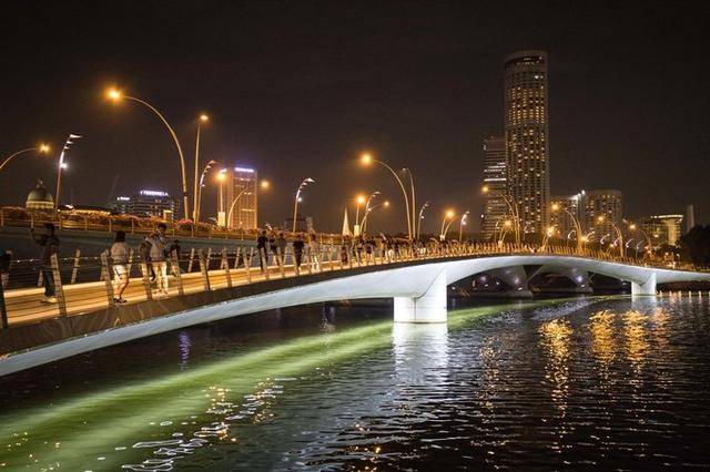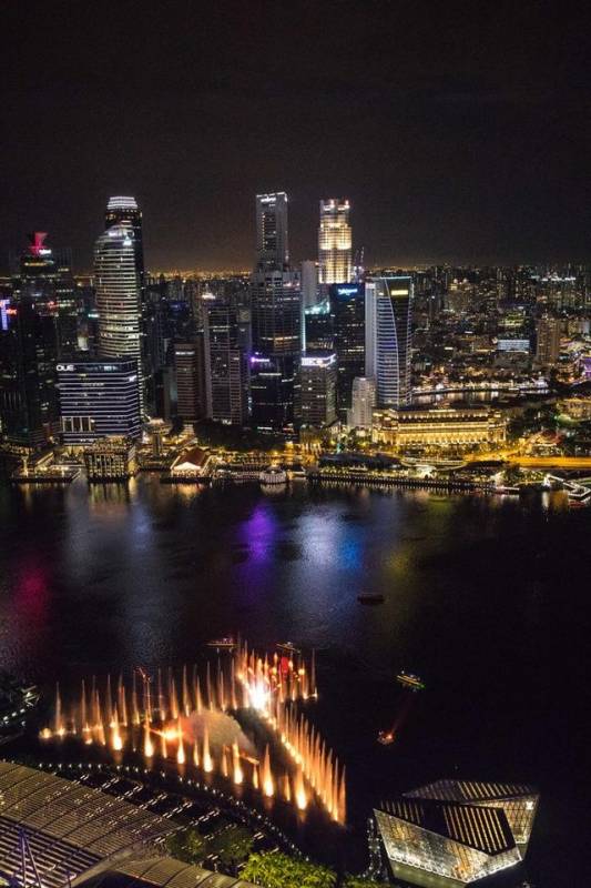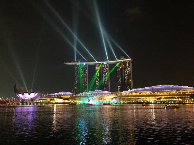 一侧夜景是新加坡城市,能看到近处的金沙购物中心、LV店、远处的富丽敦酒店、大榴梿、鱼尾狮等。金沙酒店每晚9:00到9:15有灯光秀表演,不管是从河对面看还是在金沙购物中心前面看表演,效果都很棒。
