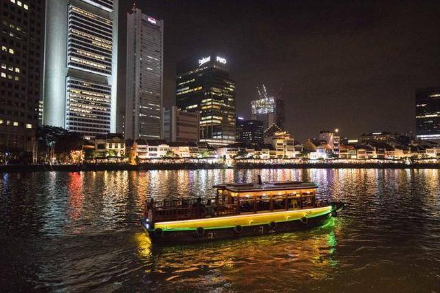 往城市里去的新加坡游船,河两岸是码头,有很多餐厅。