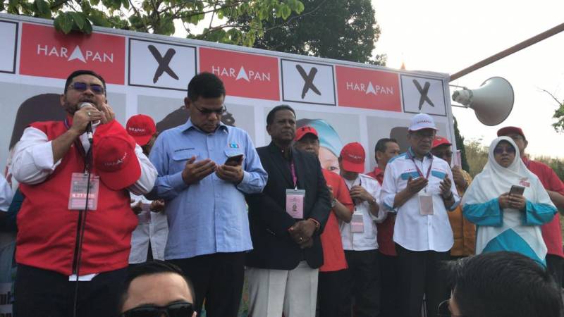 8:42am 希盟领袖在现场祷告,祈求斯特兰(左3)在补选旗开得胜,右2为拿督斯里安华。