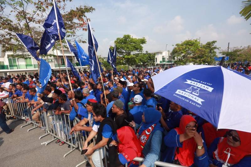 7:50am 大批国阵支持者聚集在提名中心外,准备为候选人打气。