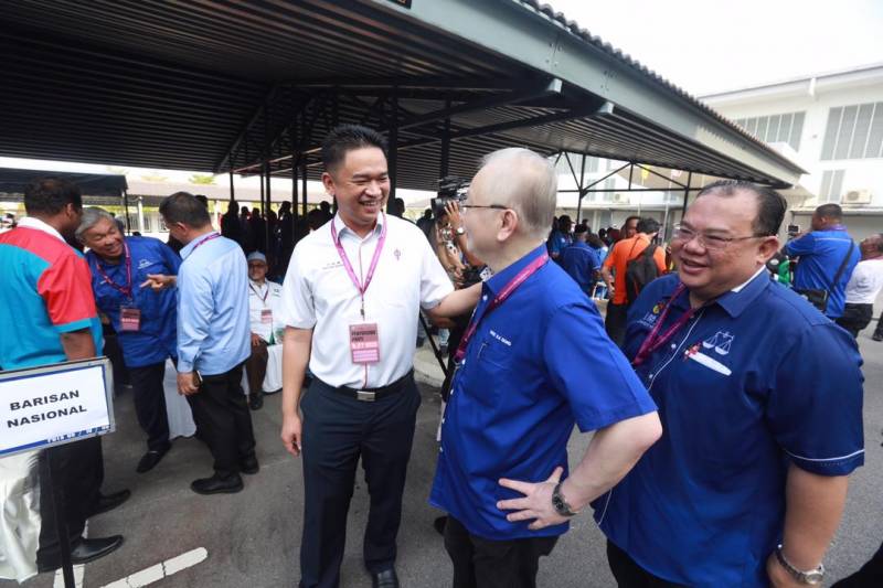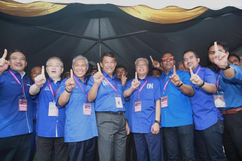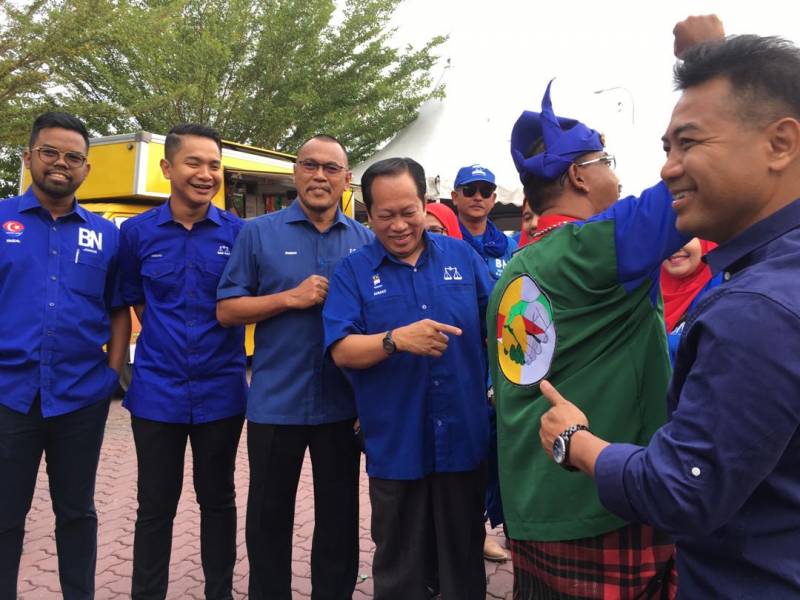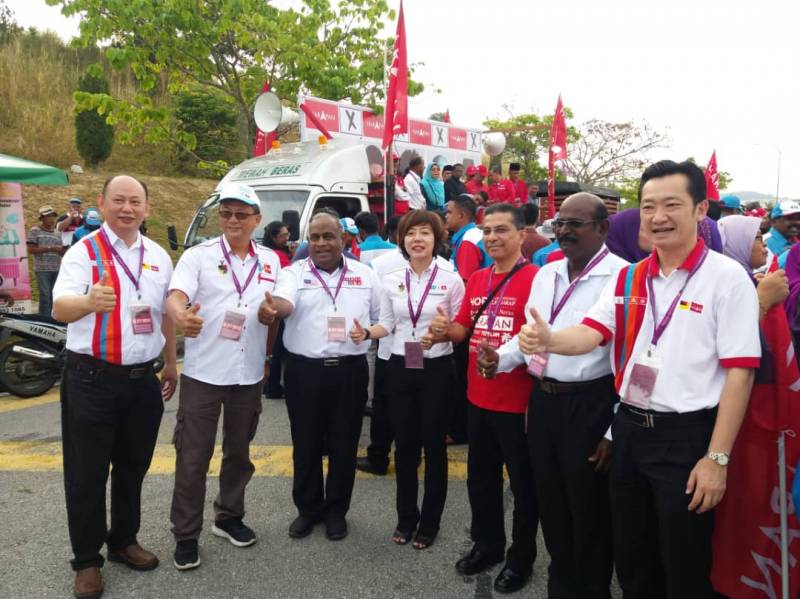 10:35am 莫哈末哈山(左)取得1号竞选编号,国阵盟友纷纷竖起1号,给他加油打气!