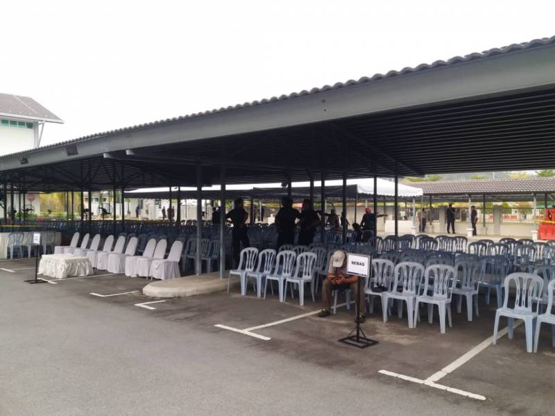 8:03am 提名中心礼堂外设有4个棚,分别希盟,国阵各1个,独立人士2个,以让候选人及支持者就坐。