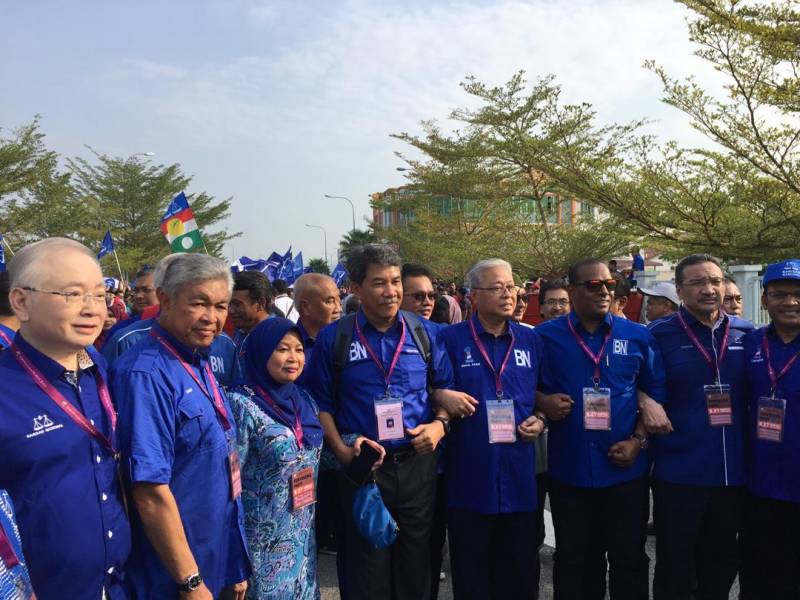 9:00am 国阵重量级领袖在提名中心外给予莫哈末哈山(右4)支持,右起为希山慕丁、国大党副主席沙拉瓦南、巫统代署理主席拿督伊斯迈沙比里、莫哈末哈山伉俪、巫统主席阿末扎希及马华总会长拿督斯里魏家祥。