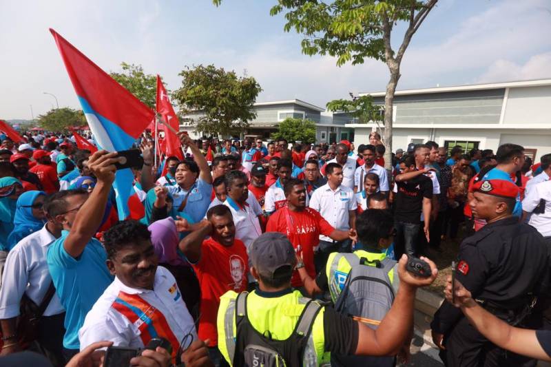 9:00am 提名中心外,国阵支持者们反应非常热烈,现场人山人海,挤得水泄不通,就连候选人莫哈末哈山也一度被挤在人群中。
