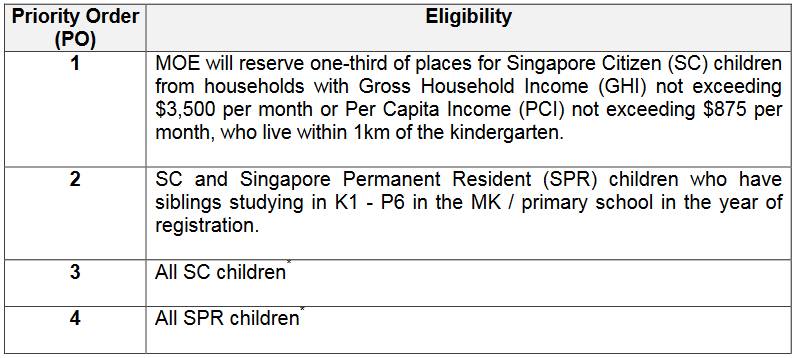 学额分配的优先次序依次为:低收入家庭的新加坡公民孩童并居住在1公里内;有兄姐就读该幼儿园,或幼儿园同处地点的小学(公民与永久居民);再来是一般申请者,公民优先。