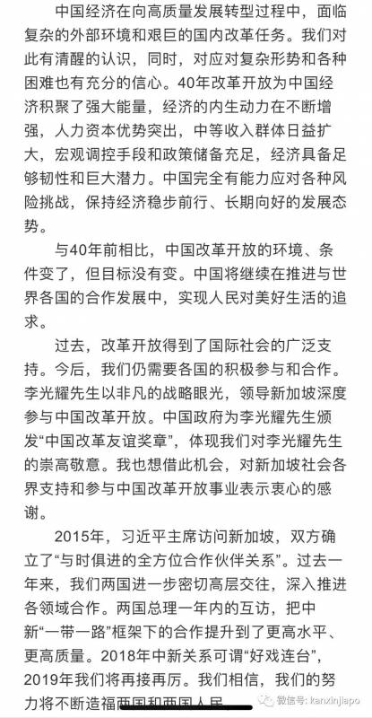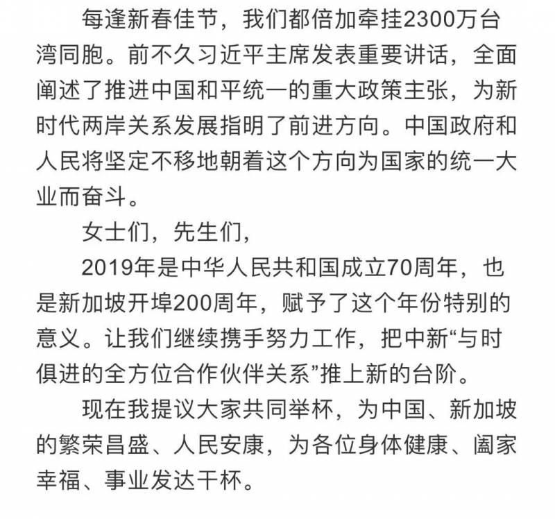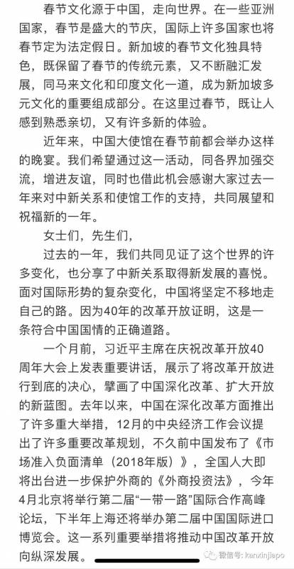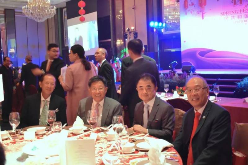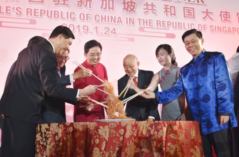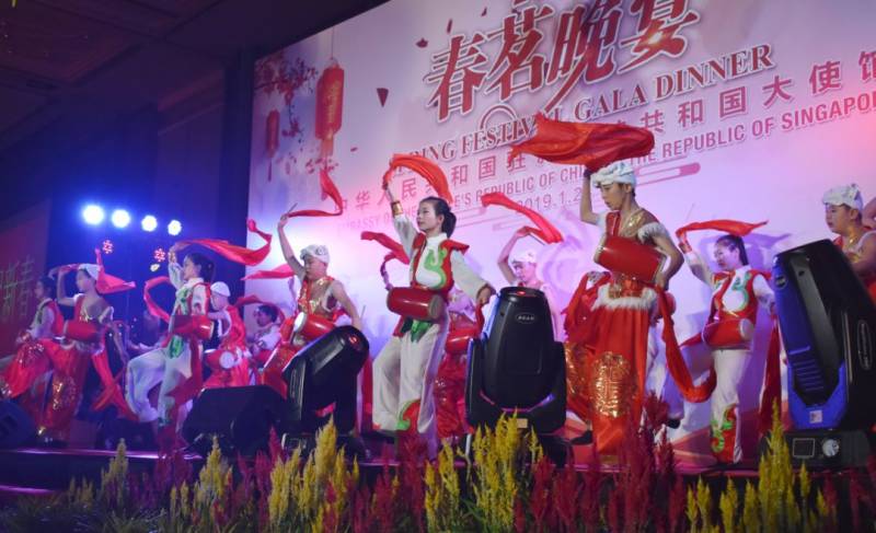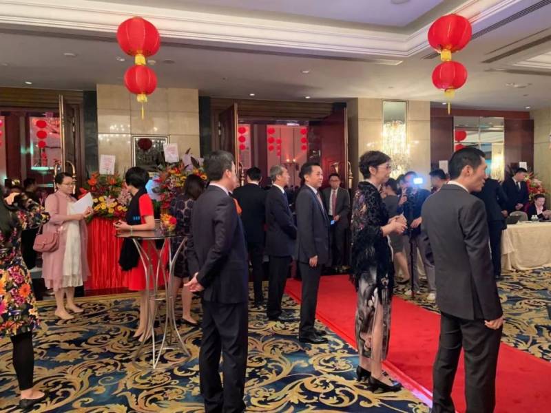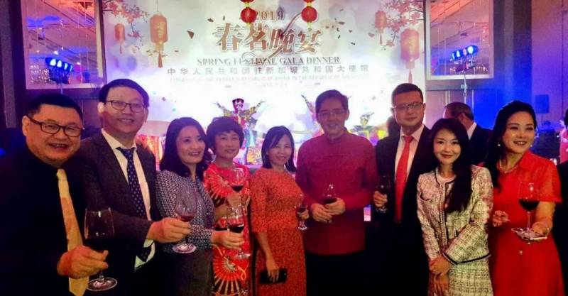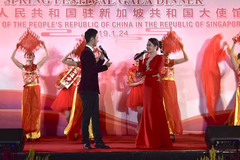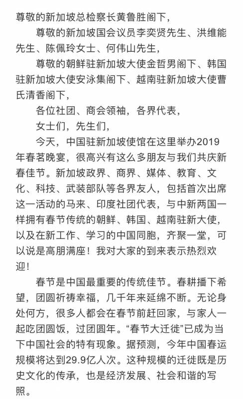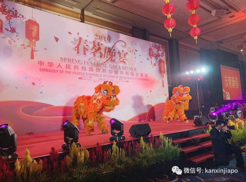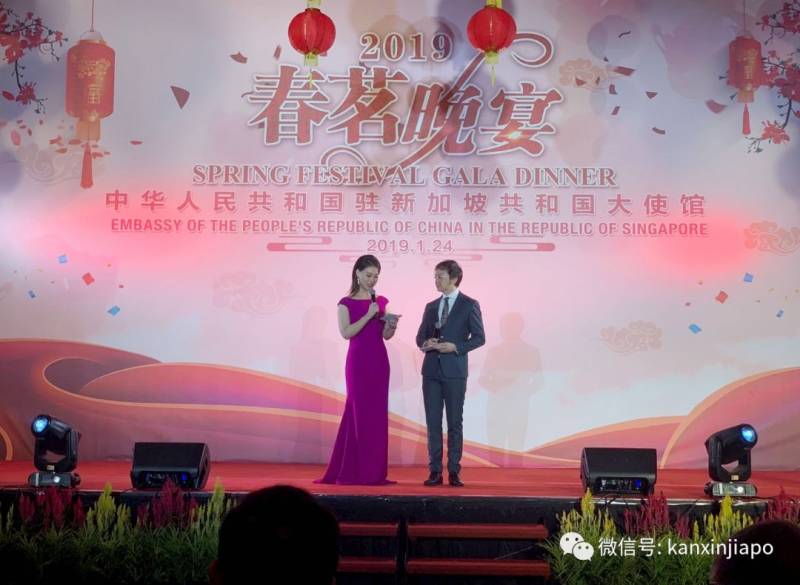 昨天(1月24日)晚上,中国驻新加坡大使馆在香格里拉酒店宴会厅举办2019春茗晚宴,各界人士齐聚一堂,庆贺农历新年。新加坡总检察长黄鲁胜、国会议员李奕贤、洪维能、陈佩玲、何伟山等各界代表以及部分驻新使节、李光耀胞弟李祥耀医生共600余人出席。