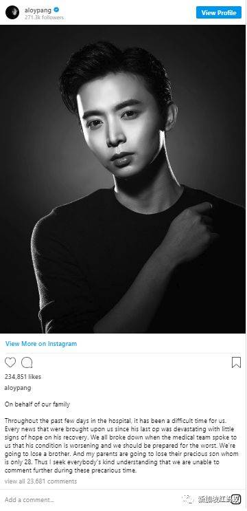 “在医院的这几天,对我们来说是很艰难的一段时间。自从他动了最后一次手术后,我们接到的每个消息,都是摧毁性的,让人感觉他康复的机会越来越渺茫。当医疗团队告诉我们他的情况恶化,要我们做好最坏打算时,我们全家人都彻底崩溃了。我们就要失去一个弟弟,我们的爸爸妈妈要失去他们的宝贝儿子,而他才28岁。所以,我们希望大家可以谅解,在这段非常时期我们无法做更多的置评。 ”