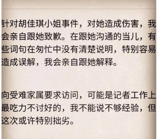 记者追访胡佳琪惹争议的事件在网上持续发酵的同时,新加坡资深娱乐记者洪铭桦星期五早上突然在Instagram连发两则贴文,称这次访问受难家属 “手段或许特别拙劣”,“有些词句在匆忙中没有清楚说明,特别容易造成误会”,会亲自向胡佳琪致歉。