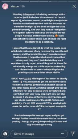 新加坡知名网红下雪也发文,指责该记者表面上是要求证冯伟衷的新闻,实际上是要得到失去至亲的女友的“独家访问”,夏雪质问这位记者为何要在这个时候让胡佳琪受更多的苦楚。
