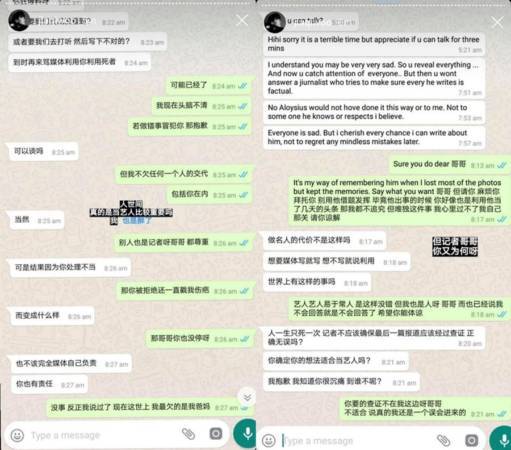 胡佳琪和家人与记者的聊天记录被公开放上网,遭到网民狠批,直指记者缺乏同理心、无视胡佳琪丧失爱人之痛。有人甚至发起请愿,要求对记者展开纪律行动。相关记者昨天(25日)在网上发声明称,会亲自向胡佳琪致歉。