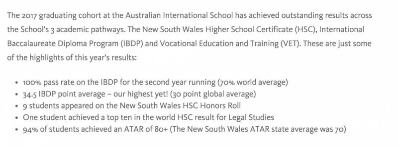 广告AIS是一所被认证的唯一的南半球以澳大利亚为基础设置的课程的的国际文凭学校。它提供全球教育学生从幼儿(包括2岁起的幼托班)到12年级学生的国际文凭组织(IB)课程。教育课程包括从幼稚园到小学五年级的小学课程(IB PYP),从六年级到十年级的中学课程(IB MYP),十一到十二年级的高中课程(DP),剑桥IGCSE课程,以及NSW HSC新南威尔士州高中证书课程。学生毕业后获得的国际文凭(IB),可直接申请进入澳洲高校学习,同时乃至全世界大多数高等学府也均承认此项文凭。