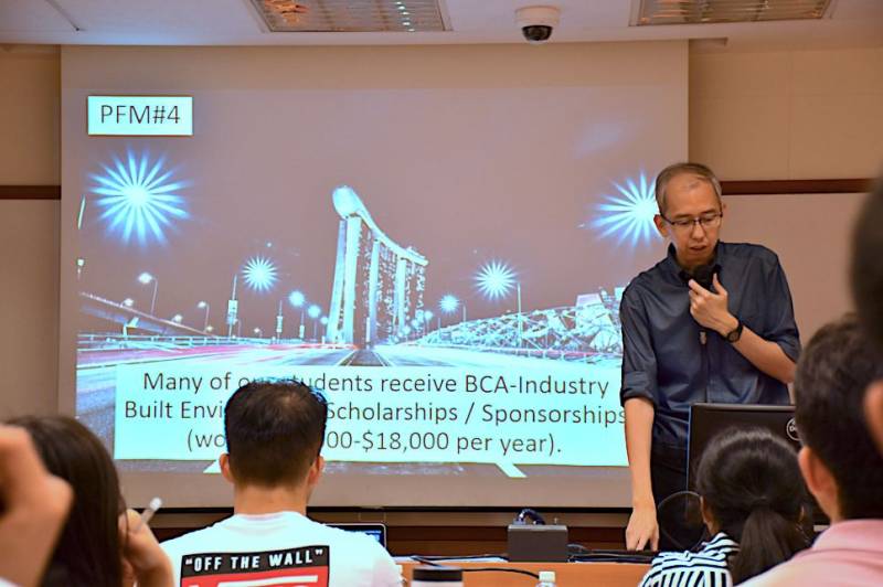 本次访谈交流主要分为教授讲解、提问交流与参观建造系SDE4大楼三个部分。为我们进行整体讲解与展示的是新国立建造系的连敬民副教授,整体讲解主要分为三个板块,分别是对建造系进行简要介绍、介绍本科专业与展望建设行业未来转型方向。