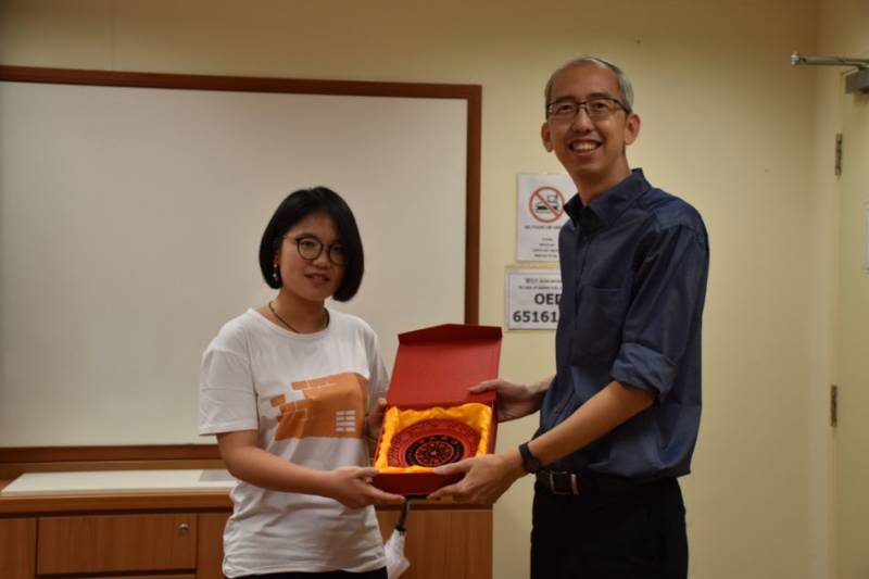在讲解之后,同学们就建造系本科培养体系、新加坡城市规划以及绿色建筑技术的运用等方面提出了自己的疑惑,并积极发表了自己的看法,与连教授进行了热烈的讨论交流。交流之后,为了表达对新加坡国立大学建造系热情接待的衷心感谢,支队向连教授赠送了精心准备的礼物。