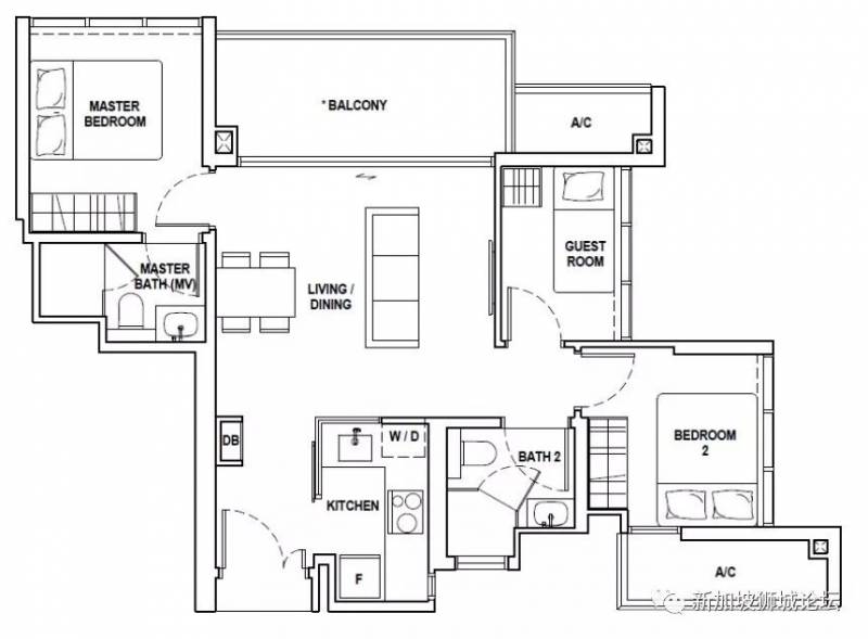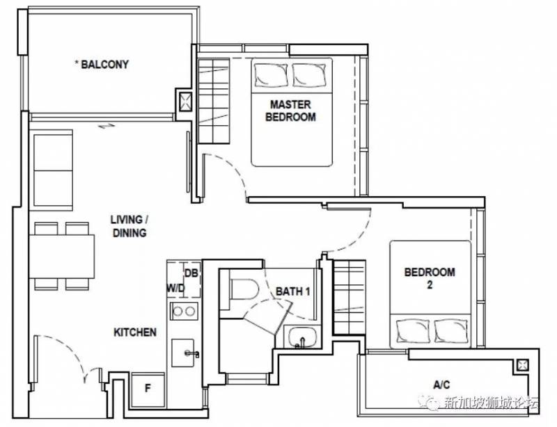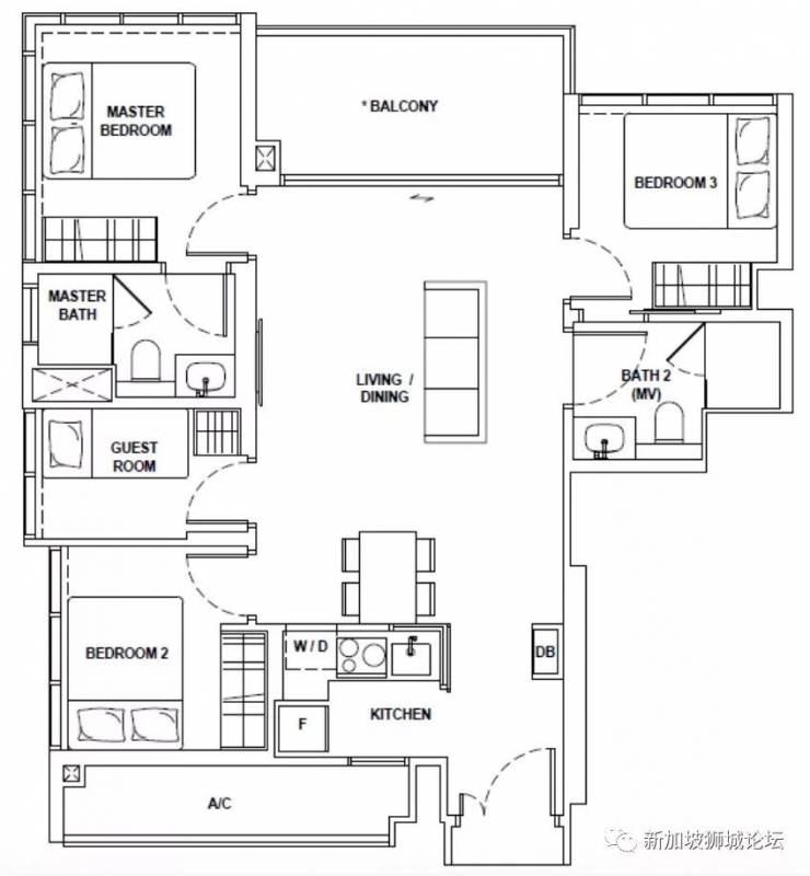 2. 两卧加客房单位,室内面积74平方米起,价格179万新币起。