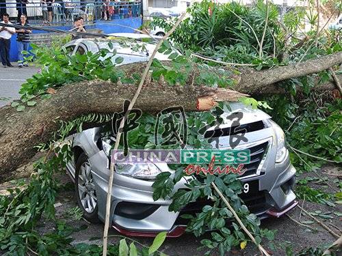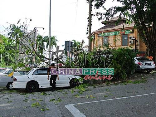 (怡保27日讯)只是为了外买一包咖啡冰,没想到就被倒下的大树枝桠压毁车顶,宝腾威拉的华裔男子司机大叹倒霉。